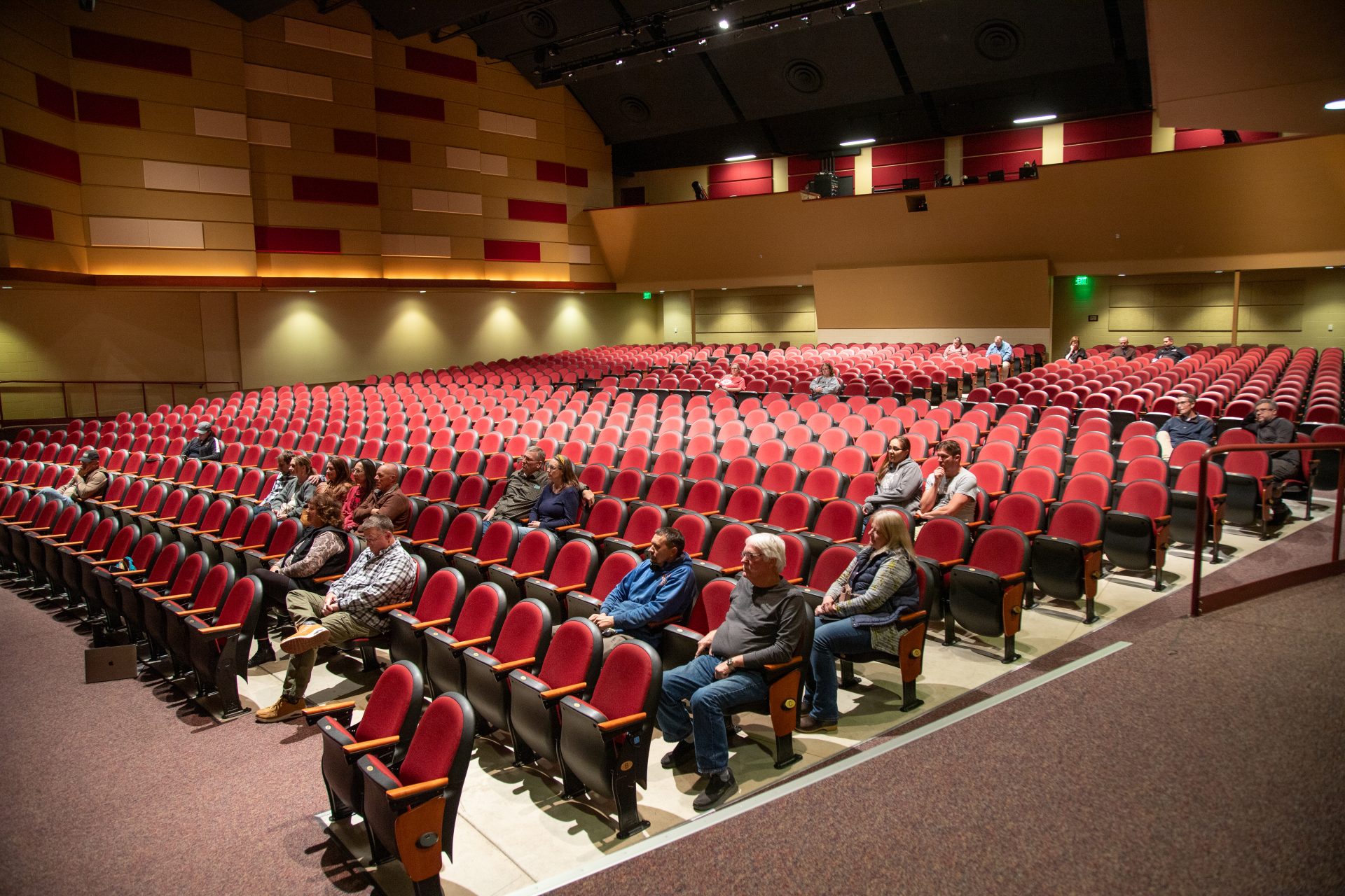 The Kuna Education Association, the local teachers’ union, hosted a Q&A on Wednesday night at the Kuna Performing Arts Center. The auditorium can hold 823, but just 25 people were scattered about the large theater.