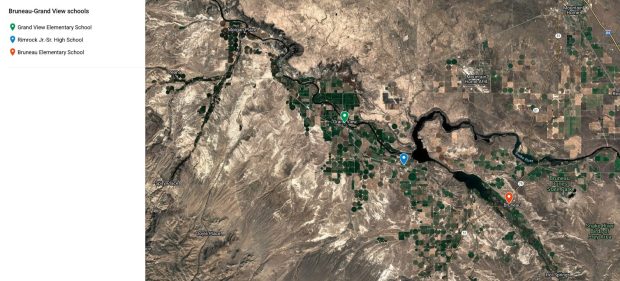 Bruneau-Grand View covers two towns — Bruneau and Grand View — along with the unincorporated community of Oreana and a wide stretch of rural land across two counties, from the Snake River to the Nevada border. The district has three schools: Bruneau Elementary, Grand View Elementary and Rimrock Junior/Senior High School, located about halfway between Bruneau and Grand View.