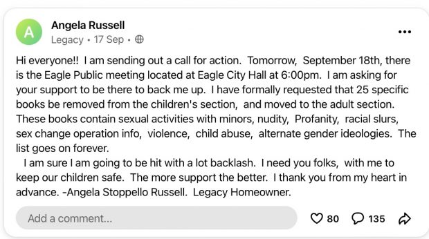In a 3-1 vote in September, Eagle trustees concurred with Russell’s claim that the 23 challenged books were “harmful.” The library board moved 20 books to the adult section and placed another three behind the library desk, where patrons must now request them.