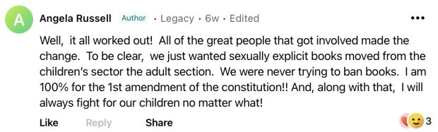 Russell claimed ownership of the notices in a social media post the day before the library board’s vote. Russell posted to the neighborhood-focused social networking website Nextdoor seeking support in anticipation of “a lot of backlash” for her requests.