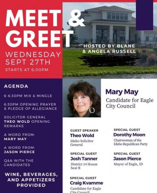 A flyer for last year’s candidate meet-and-greet advertised former Idaho solicitor general Theo Wold as a “guest speaker,” and Idaho Republican Party Chairwoman Dorothy Moon as a “special guest.”