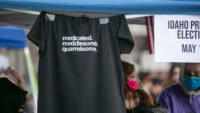 A political organizer promoted free stickers with “Medicated, meddlesome and quarrelsome,” the words from Boise State University professor Scott Yenor that sparked backlash late last year for being anti-woman. When Emily Walton, co-founder of anti-extremist group the Idaho 97 Project, mentioned Yenor’s name, the crowd booed in unison.
