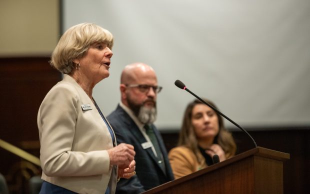 Sen. Janie Ward-Engelking, D-Boise, addresses the audience at the Idaho School Boards Association Day on the Hill on Feb. 16. To her left is Sen. James Ruchti, D-Pocatello, and Quinn Perry, deputy director of the ISBA. (Sean Dolan/EdNews)