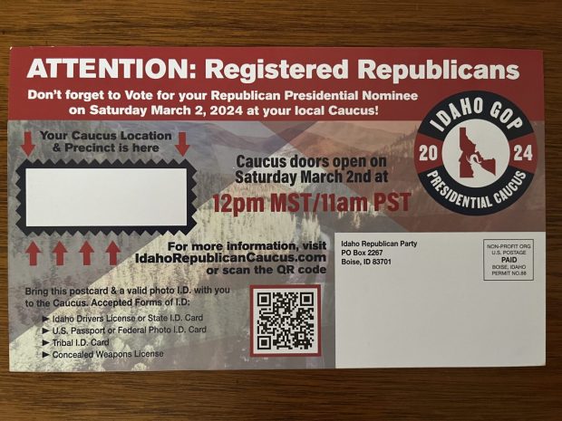 Idaho Republican Party officials are mailing postcards with a red border to every registered Republican household in the state this week, Moon said. That postcard will list the voter’s caucus location and precinct location on it, and Moon encouraged Republicans to hang on to their postcard and bring it with them to the caucus, along with their ID. If they forget or lose their postcard, Republicans can also find their caucus location using their county, voting precinct and legislative districts, which is available through the Vote Idaho website.