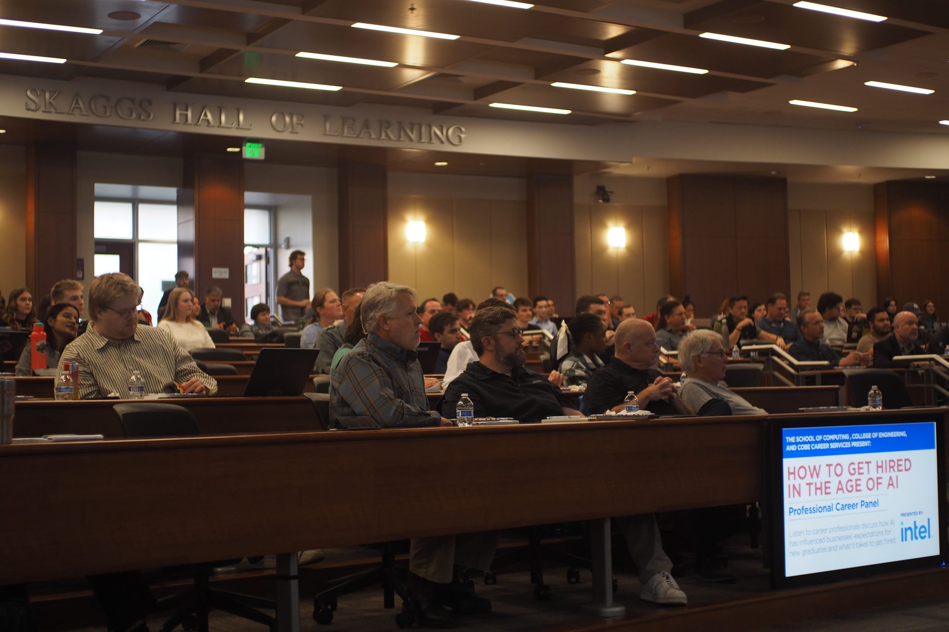 Around 200 students and dozens of tech industry professionals filled a lecture hall on Friday, Nov. 14, in the Micron Business and Economics building at Boise State University for a panel called “How to get hired in the age of AI” organized by the university’s School of Computing.