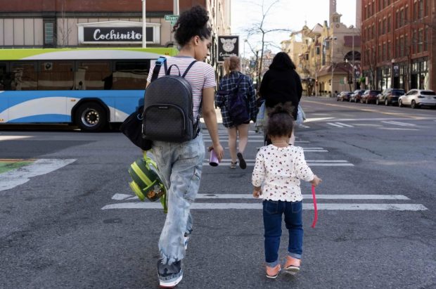 Kaleeya Baldwin and her daughter, Akylah, walk home after school. Credit: Camilla Forte/The Hechinger Report