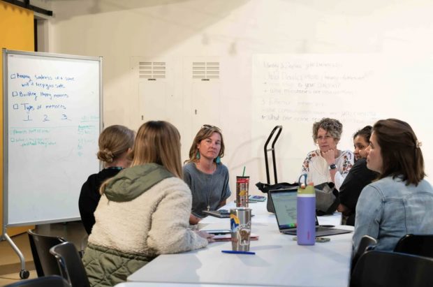 Principal Melissa Pettey, center right, meets with Lumen High School support staff to discuss current student needs. Credit: Camilla Forte/The Hechinger Report