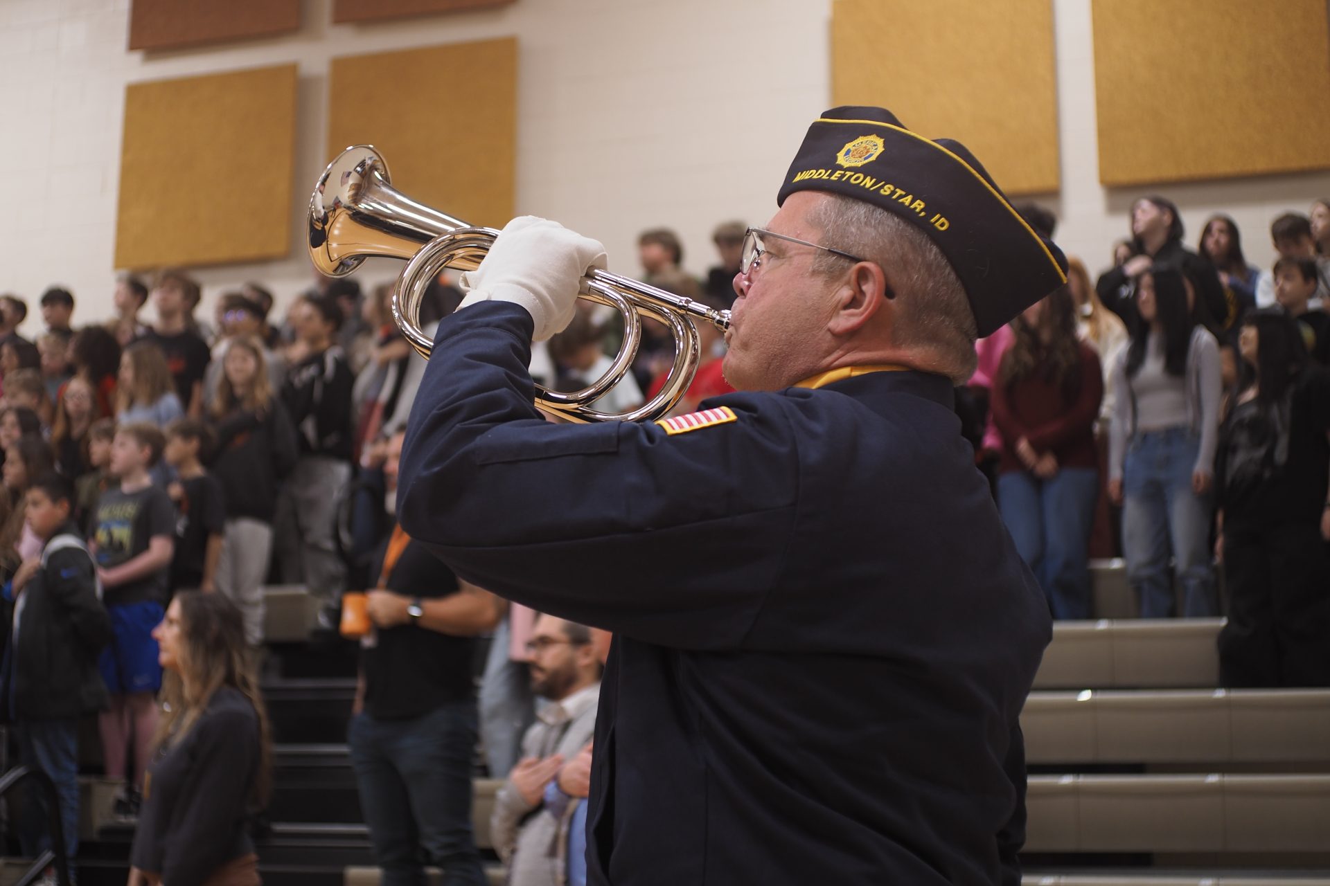 Star Middle choir and band students performed most of the music, punctuated by the Caldwell Police Pipes and Drums. They started with the “Star Spangled Banner” and worked through the theme songs for each branch of the United States Military.