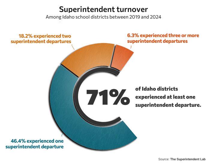 Idaho’s rate is far above the national level, where 44.4% of districts experienced a superintendent departure between the 2019 and 2024 school years, according to The Superintendent Lab, a research group at the University of Texas at Austin.