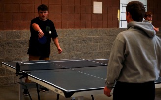 The music is loud and students take turns requesting songs. One group of friends plays cards while another does adult coloring. Students also play ping-pong, cornhole, and giant connect-four.