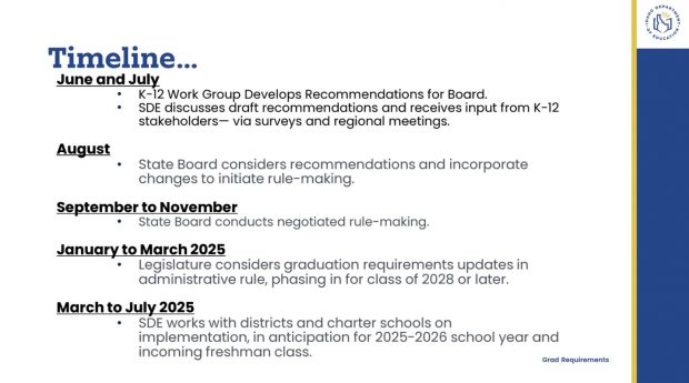 The meetings and survey are the first steps in a yearlong process that will include seeking approval from the State Board of Education and the legislature. If approved, the changes would likely first apply to the class of 2028 or 2029, and could begin being phased in as early as the 2025-26 school year.