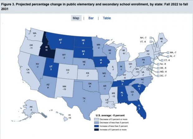 But Idaho is an outlier in one way — it’s one of 10 states where public school enrollment is projected to grow between 2022 and 2031, according to the National Center for Education Statistics. Of those, Idaho is projected to have the largest percent increase in total enrollment over this period, with 11% growth predicted.