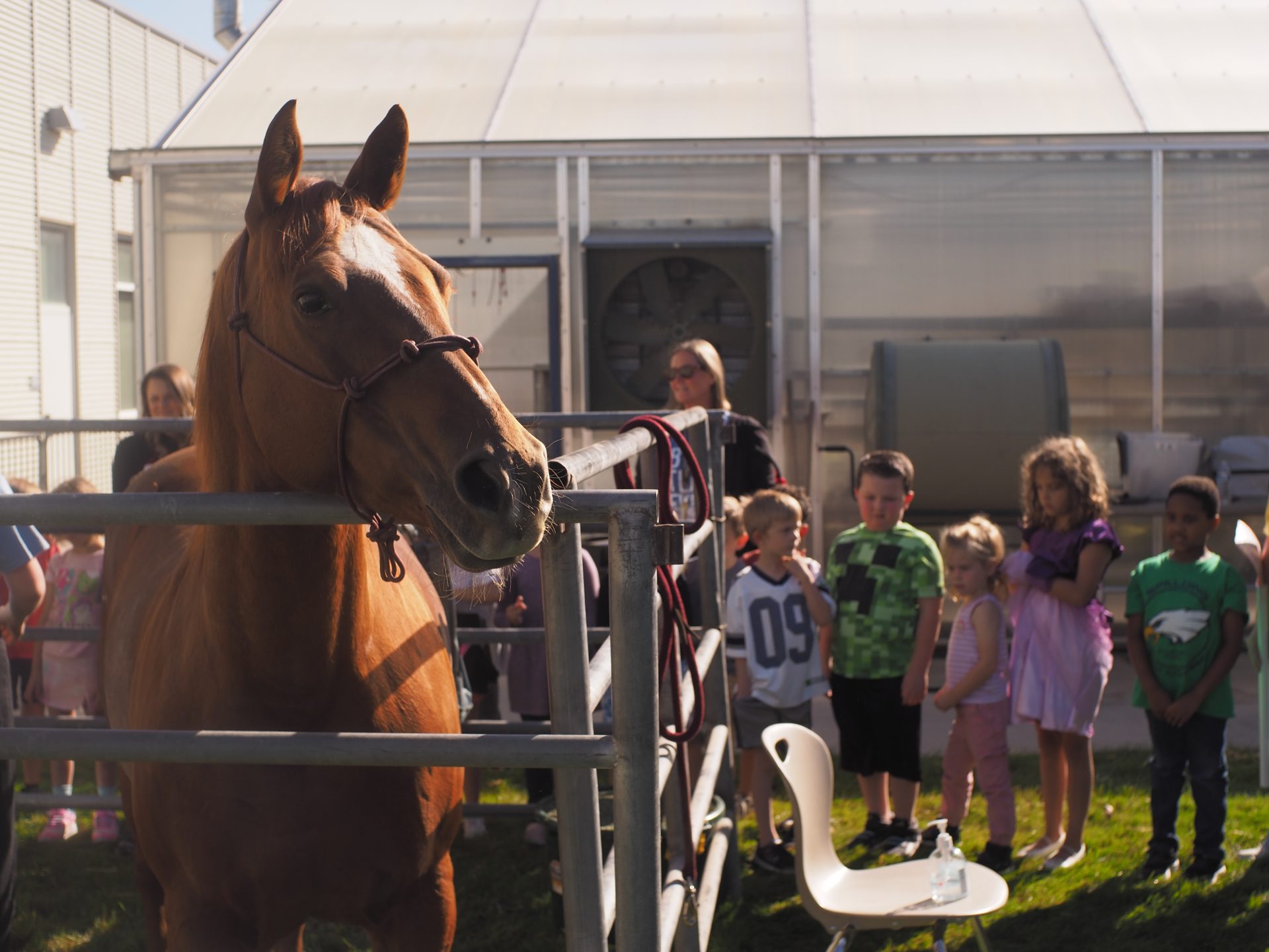 A horse gazes handsomely into the camera for a portrait with some West Ada first-graders in the background. Younglings had the opportunity to meet farm animals like horses and cows at the district’s Agriculture Expo.