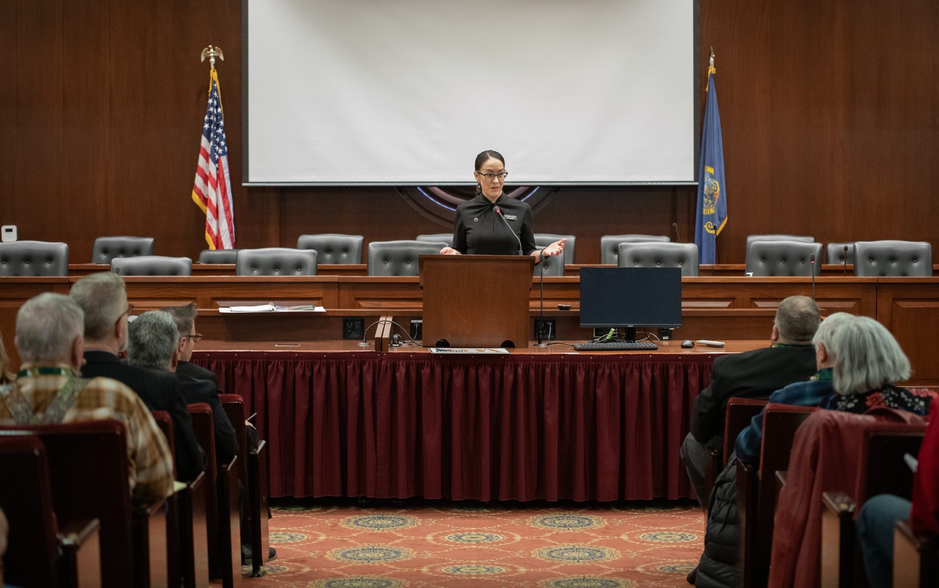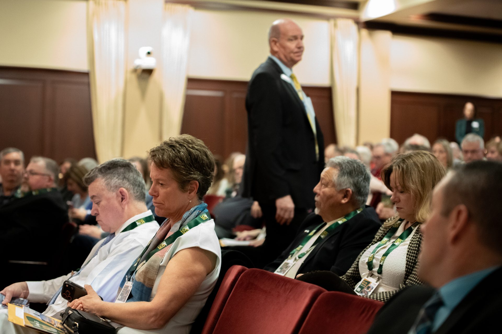 Lara Stone, trustee for Blaine County School District and the 2025 ISBA Board Chair of the Year, listens to House Speaker Mike Moyle answer questions at the ISBA Day on the Hill on Monday, Feb. 16, 2026, at the Lincoln Auditorium in Boise. (Sean Dolan/EdNews)
