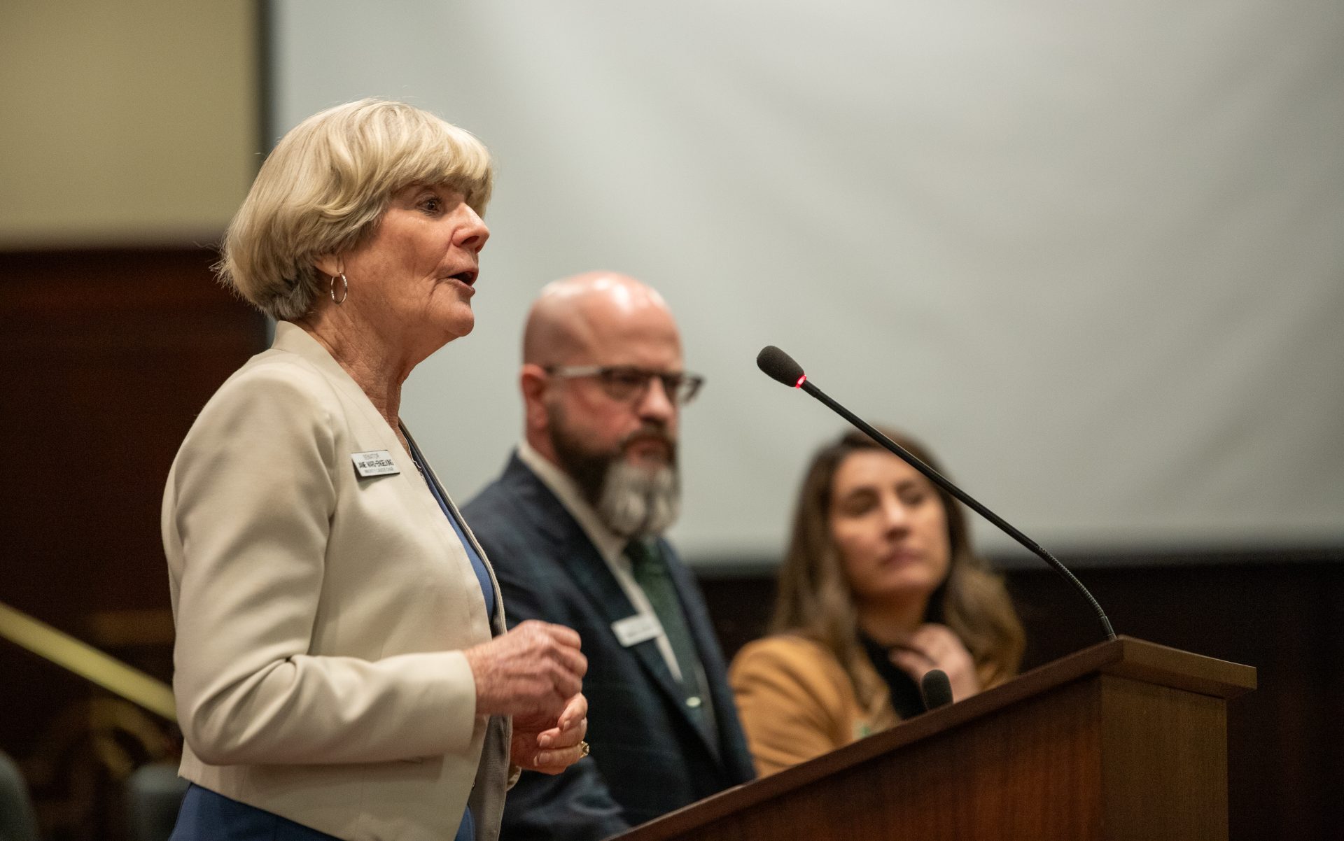 Sen. Janie Ward-Engelking, D-Boise, addresses the audience at the ISBA Day on the Hill on Monday, Feb. 16, 2026, at the Lincoln Auditorium in Boise. To her left is Sen. James Ruchti, D-Pocatello, and Quinn Perry, deputy director of the ISBA. (Sean Dolan/EdNews)