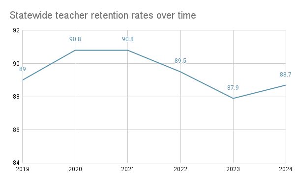 That’s a slight uptick from 2022-23, reversing a multiple-year trend of post-pandemic declines in the statewide teacher retention rate.