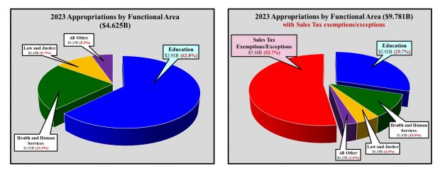 The following pie charts put the magnitude of these tax breaks in perspective. The chart on the left shows the current 2023 budgets for key functional areas based on the $4.6 billion in revenue the legislature chose to collect. The chart on the right adds the additional $5.2 billion in sales tax revenue into the pie chart that the legislature chose not to collect – more than the entire 2023 budget!